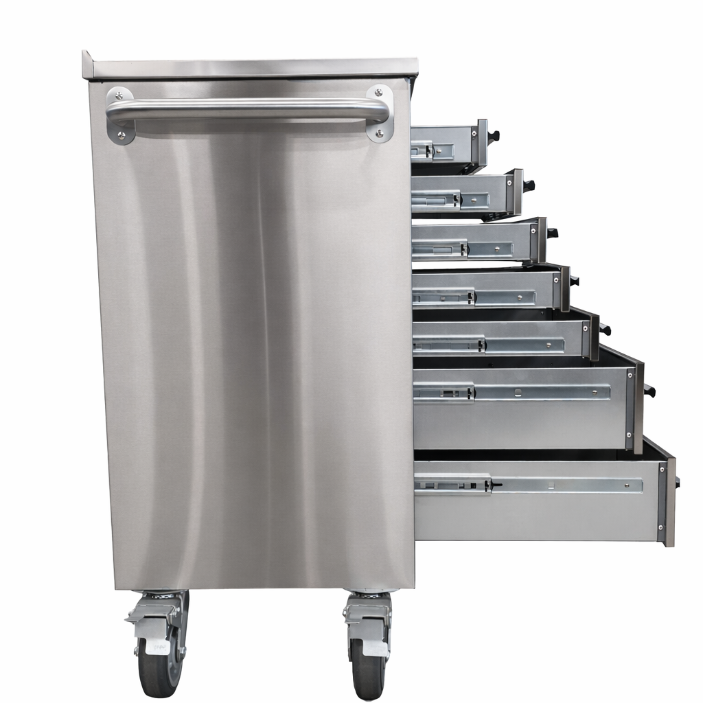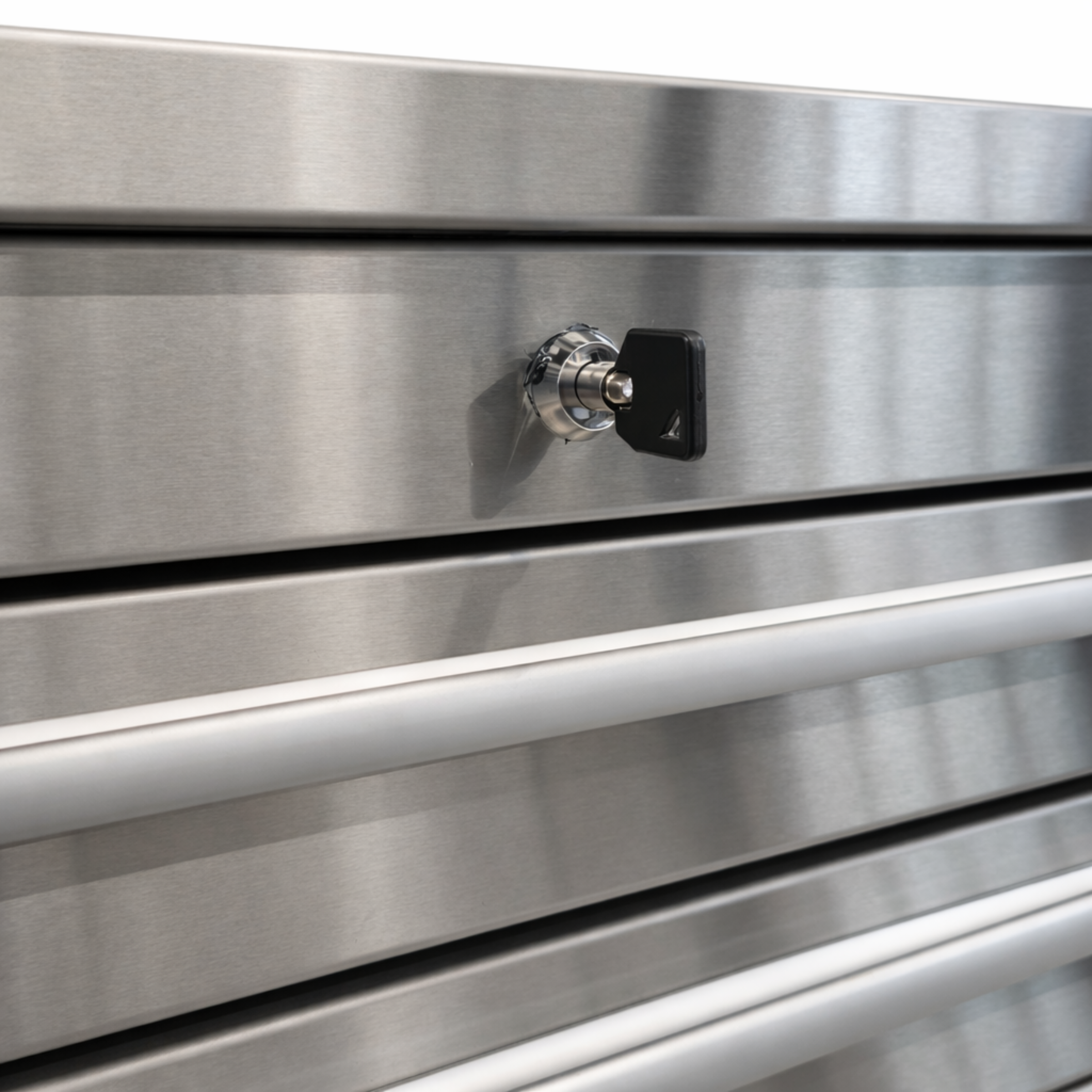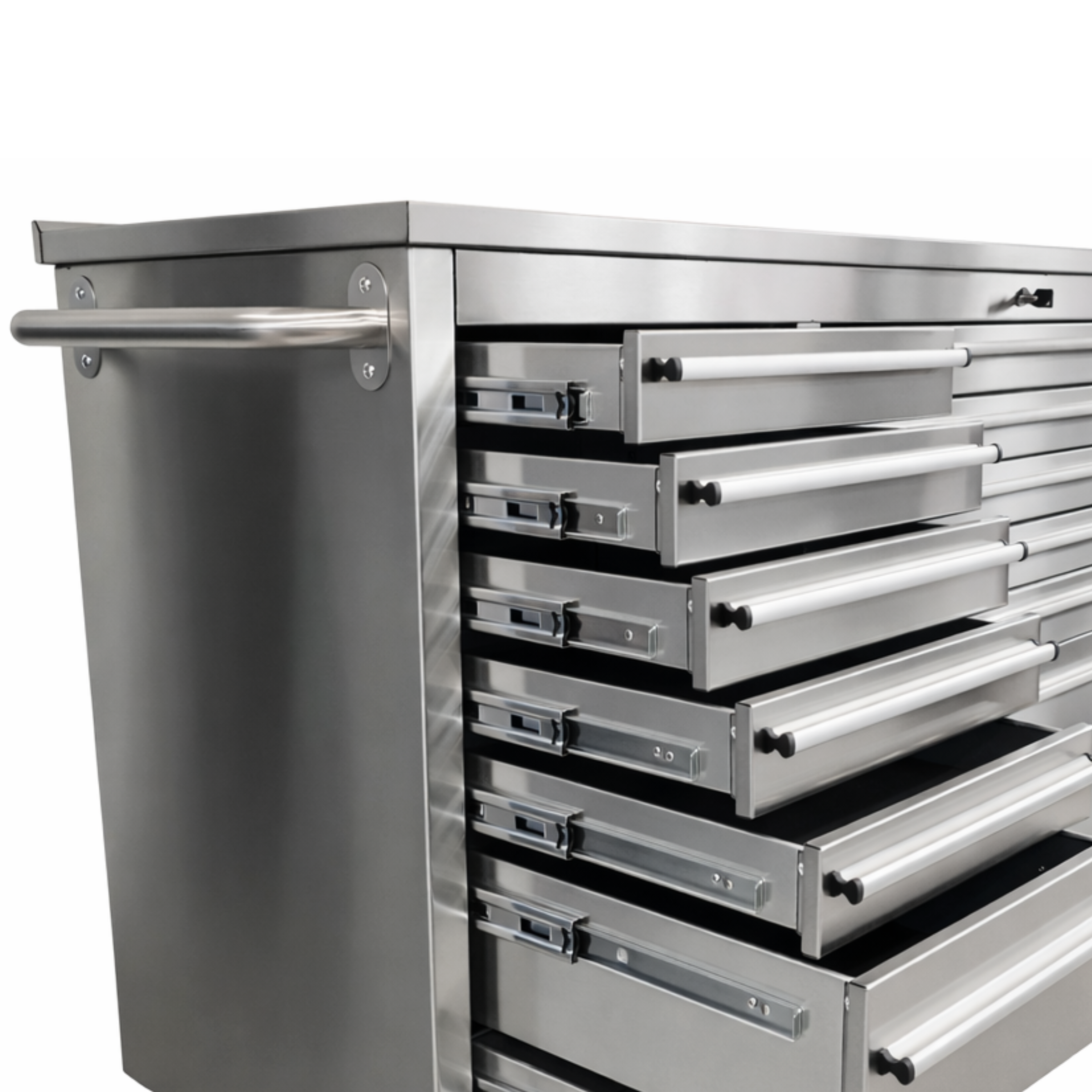 Die Aufteilung ist durchdacht: Insgesamt 14 Schubladen in verschiedenen Höhen, die sich perfekt für kleinteiliges Zubehör bis hin zu schwerem Gerät eignen. Auf der rechten Seite befindet sich ein geräumiges Schrankfach mit Tür, ideal für größere Maschinen oder Behälter. Die Schubladen laufen auf kugelgelagerten Schwerlastauszügen, was ein geräuscharmes Öffnen und Schließen auch unter hoher Belastung garantiert.