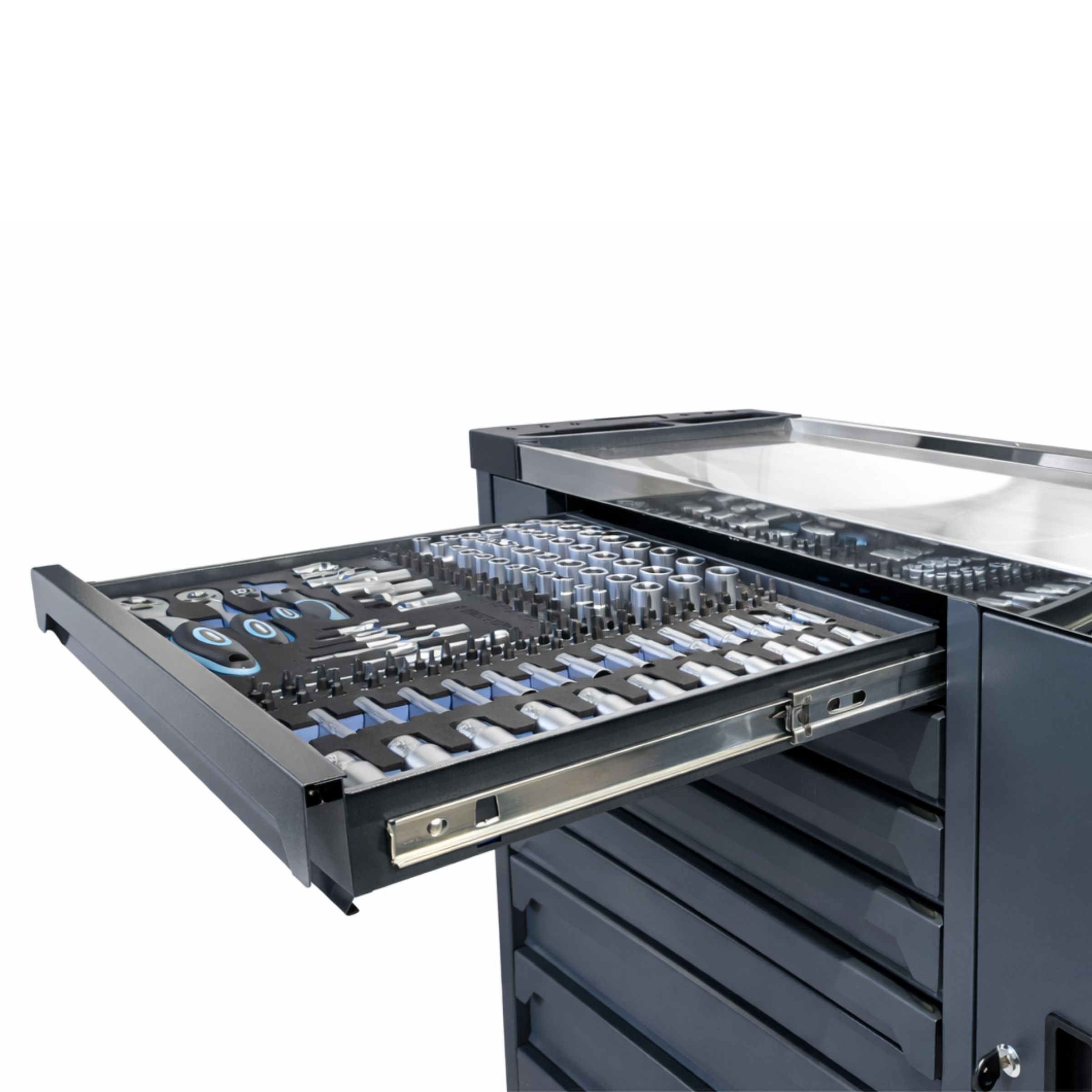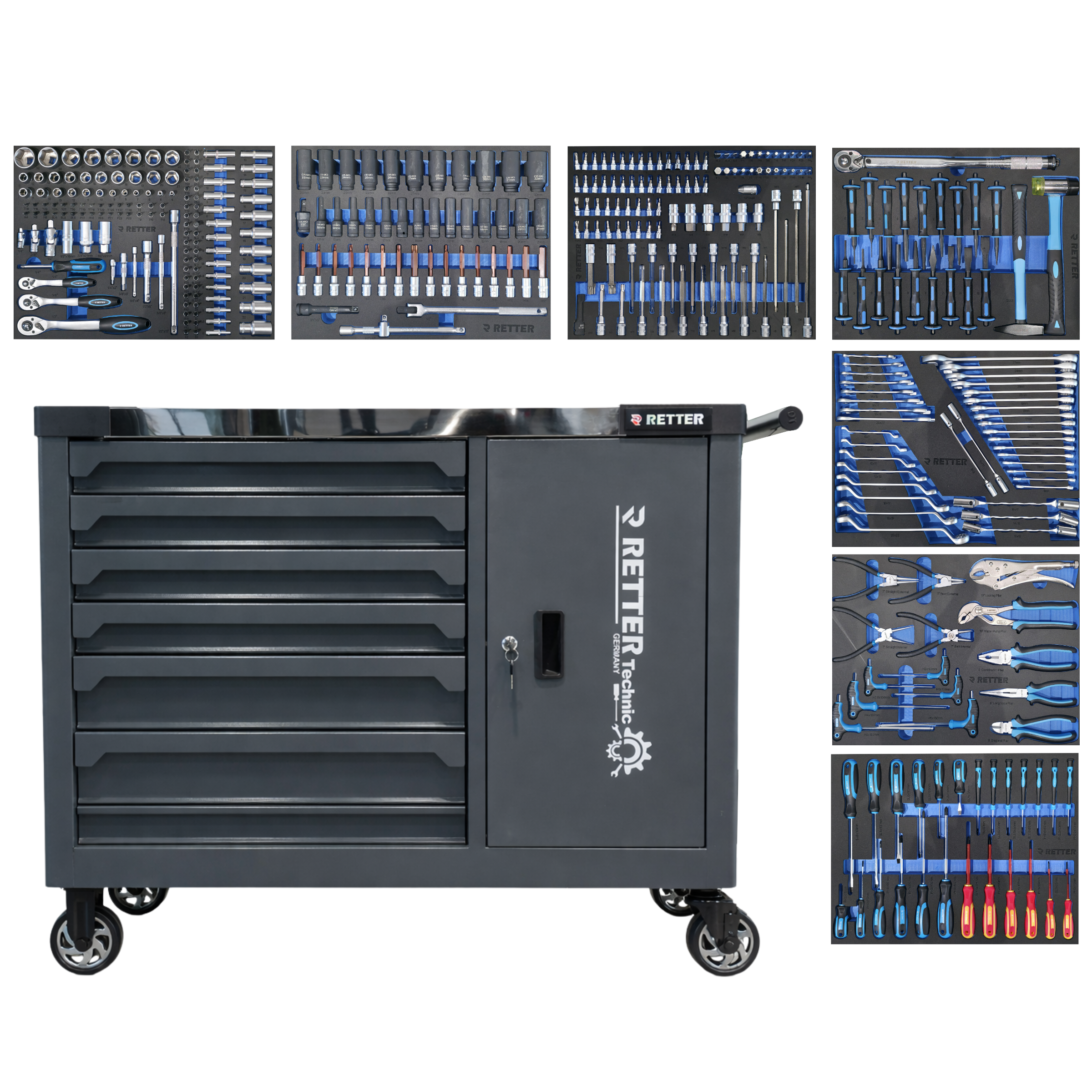 Der RETTER RS7 Werkstattwagen wurde für professionelle Anwendungen entwickelt und überzeugt durch seine robuste Bauweise, hochwertige Verarbeitung und umfangreiche Werkzeugausstattung. Mit 7 Schubladen und einem zusätzlichen Türfach mit Werkzeugwand bietet der Wagen optimalen Stauraum für Werkzeuge und Zubehör. Insgesamt enthält der Werkstattwagen 402 präzise gefertigte Werkzeuge, die übersichtlich in hochwertigen EVA-Schaumeinlagen organisiert sind.