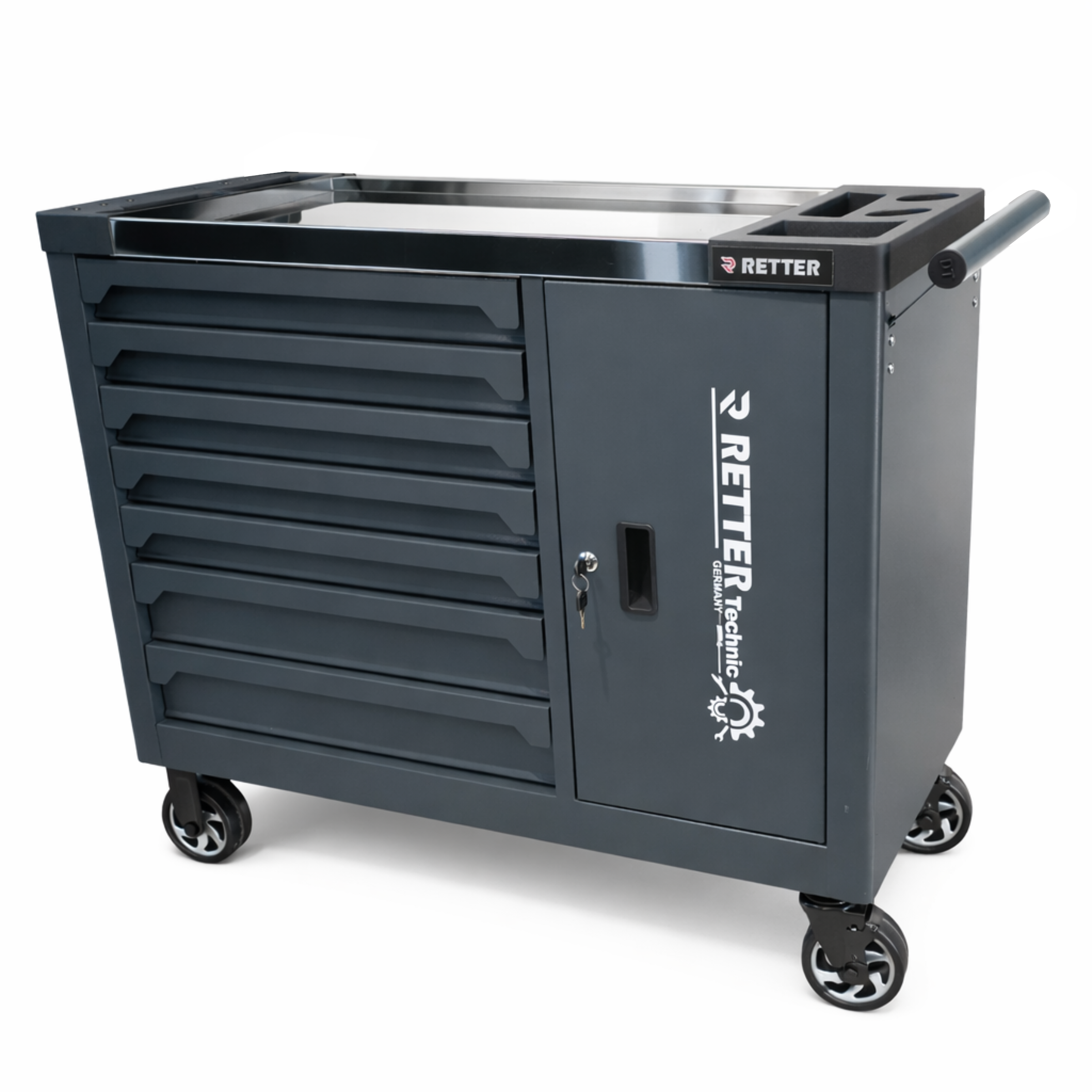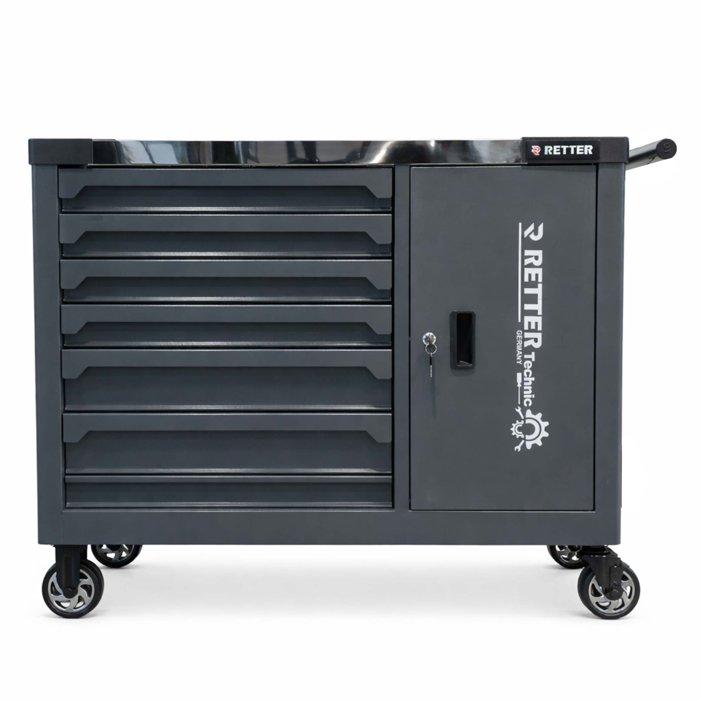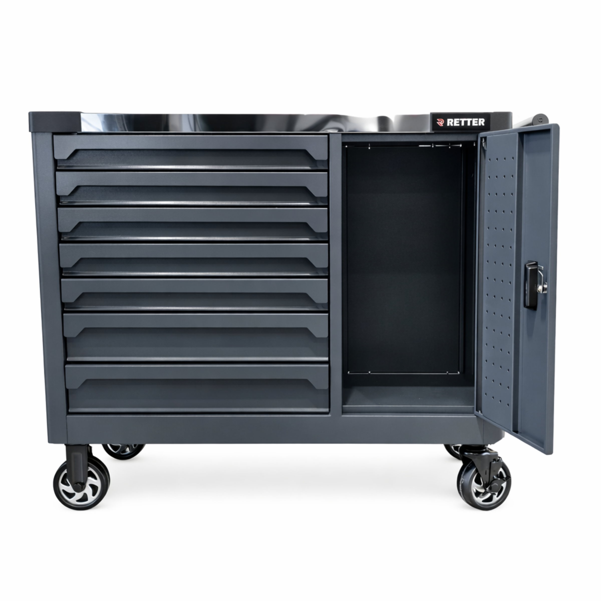 Die Schubladen mit 100 % Vollauszug ermöglichen einen schnellen und vollständigen Zugriff auf alle Werkzeuge. Antirutschmatten sorgen dafür, dass Werkzeuge sicher an ihrem Platz bleiben. Die spiegelpolierte Edelstahl-Arbeitsplatte bietet eine robuste und pflegeleichte Arbeitsfläche für tägliche Werkstattarbeiten und ist besonders widerstandsfähig gegen Verschleiß. Der integrierte Türfach mit Doppelwand-Technologie erweitert den Stauraum zusätzlich. Die Lochwand auf der Türinnenseite ermöglicht eine praktische Aufbewahrung von Werkzeugen und Zubehör. Für maximale Mobilität ist der Werkstattwagen mit Vollgummirädern (Ø 125 mm) ausgestattet. Zwei Lenkrollen mit Feststellbremse sorgen für sicheren Stand während der Arbeit. Die zentrale Verriegelung mit Einzelentriegelung der Schubladen verhindert ein unbeabsichtigtes Öffnen während des Transports. Mit seinem modernen Industrie-Design in RAL7016 Anthrazitgrau und der hochwertigen Pulverbeschichtung ist der RETTER RS7 sowohl optisch als auch technisch eine professionelle Lösung für jede Werkstatt