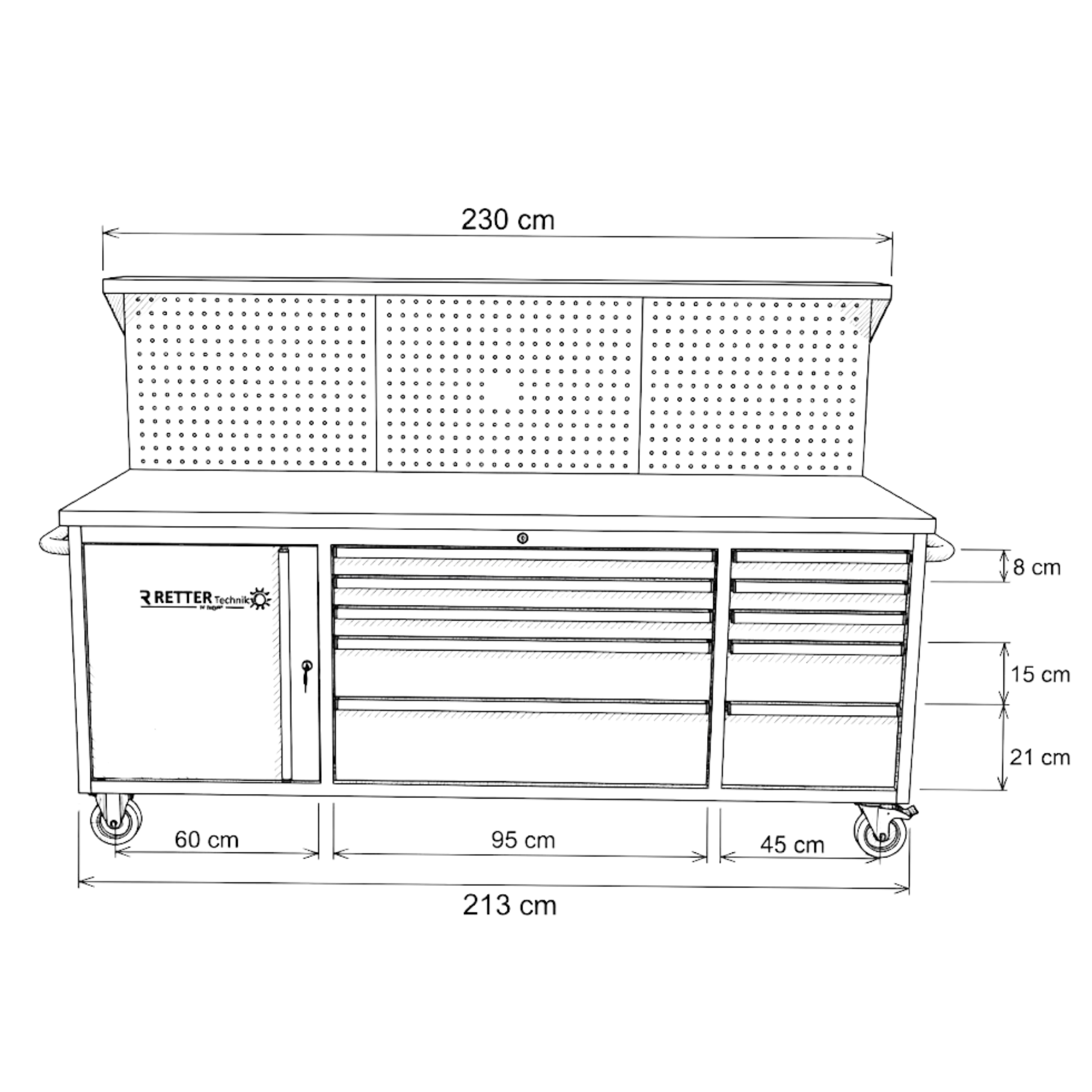 Die RETTER RS2 Workstation Werkbank mit 10 Schubladen und einem großzügigen Schrankfach ist die ultimative Lösung für Werkstätten. Mit Maßen von 230 cm x 92 cm x 51 cm bietet sie viel Platz und eine beeindruckende Traglast von 180 kg.