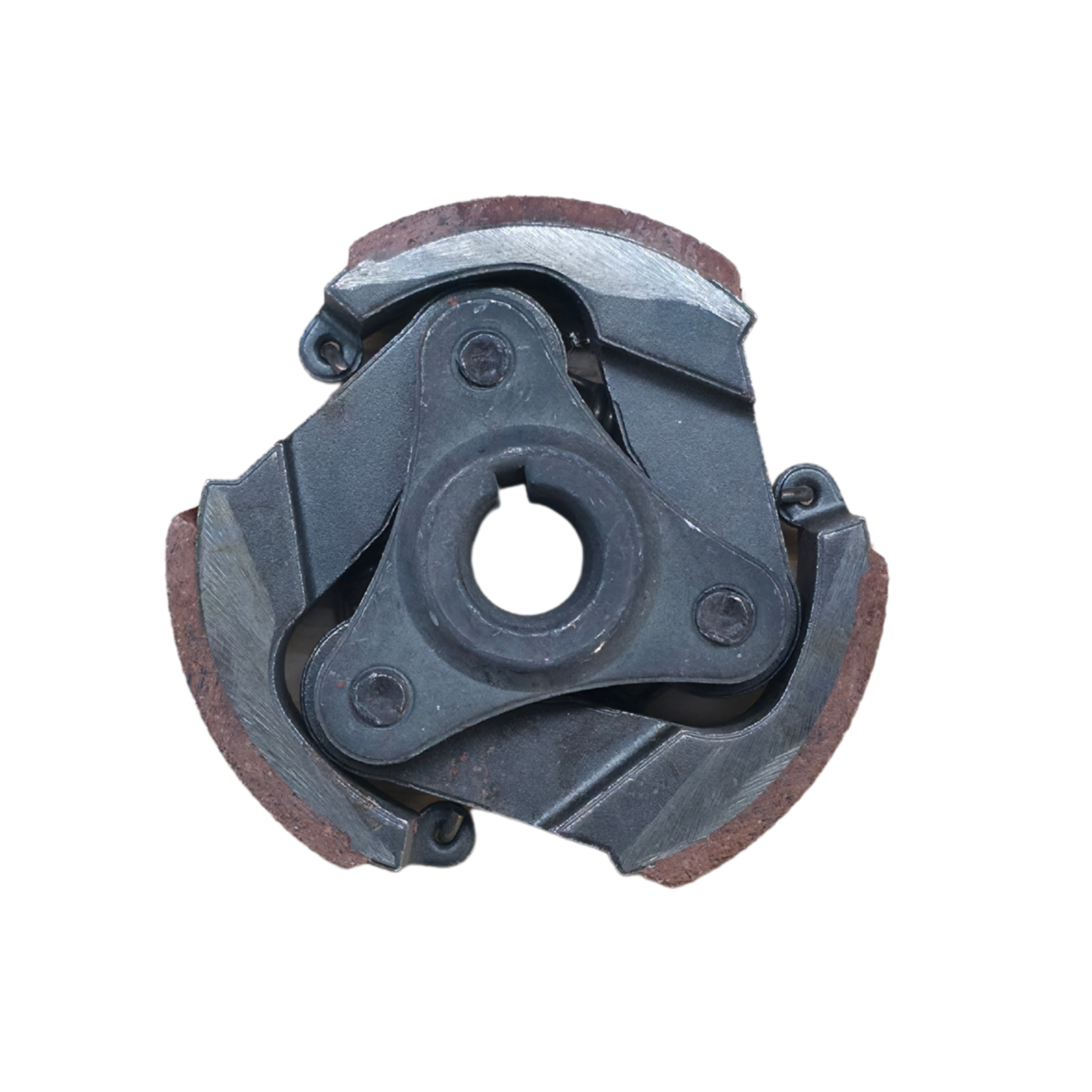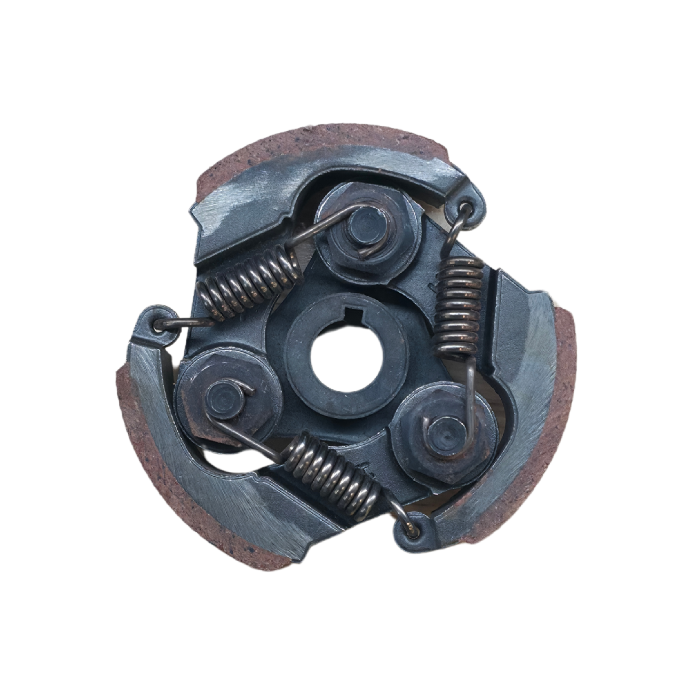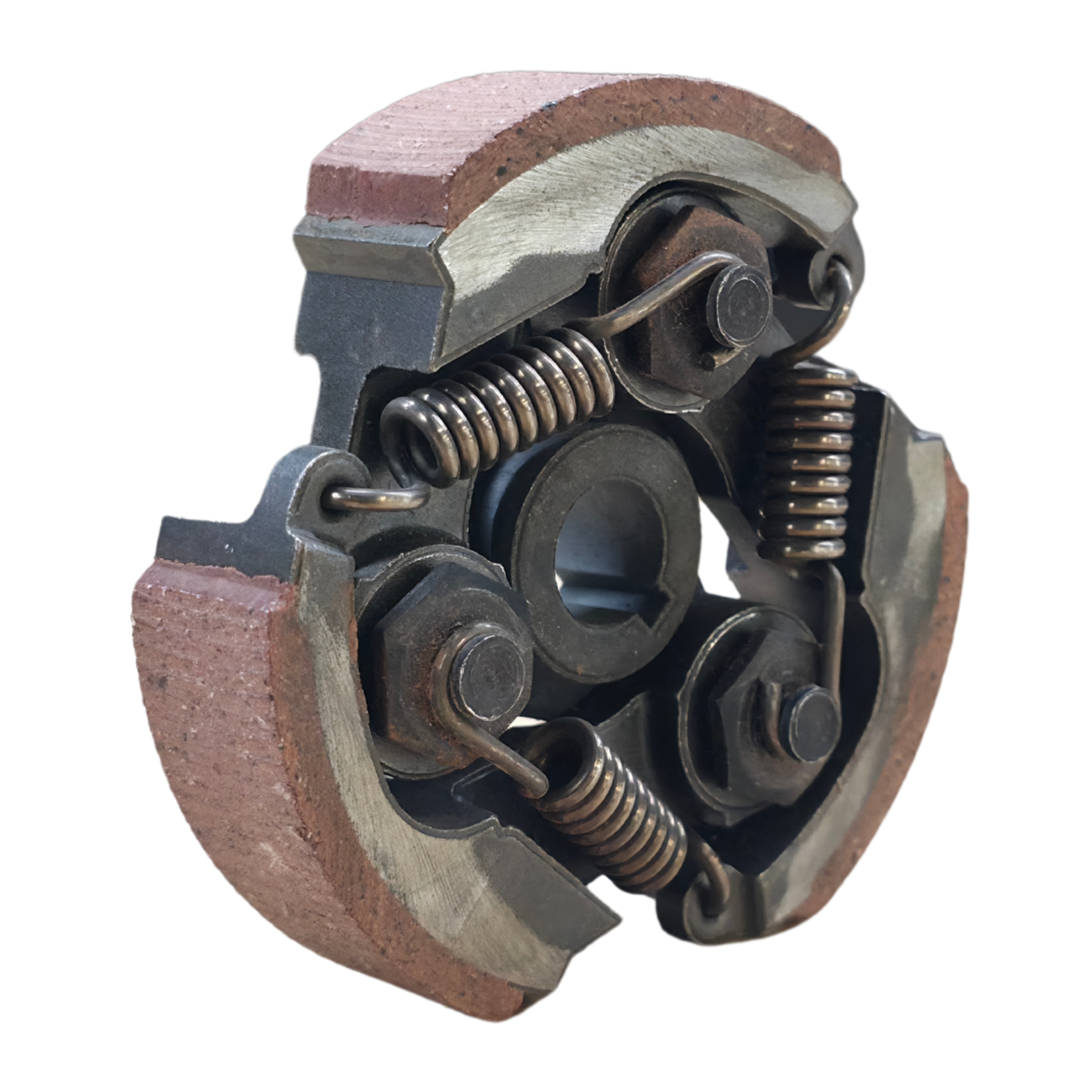 Die Konstruktion mit drei Kupplungsbacken sorgt für eine gleichmäßige Kraftübertragung und zuverlässiges Einkuppeln. Die Reibbeläge sind fest mit den Backen verbunden und für den regelmäßigen Einsatz ausgelegt. Integrierte Federn stellen die Rückstellung der Backen sicher und gewährleisten ein sauberes Trennen im Leerlauf.