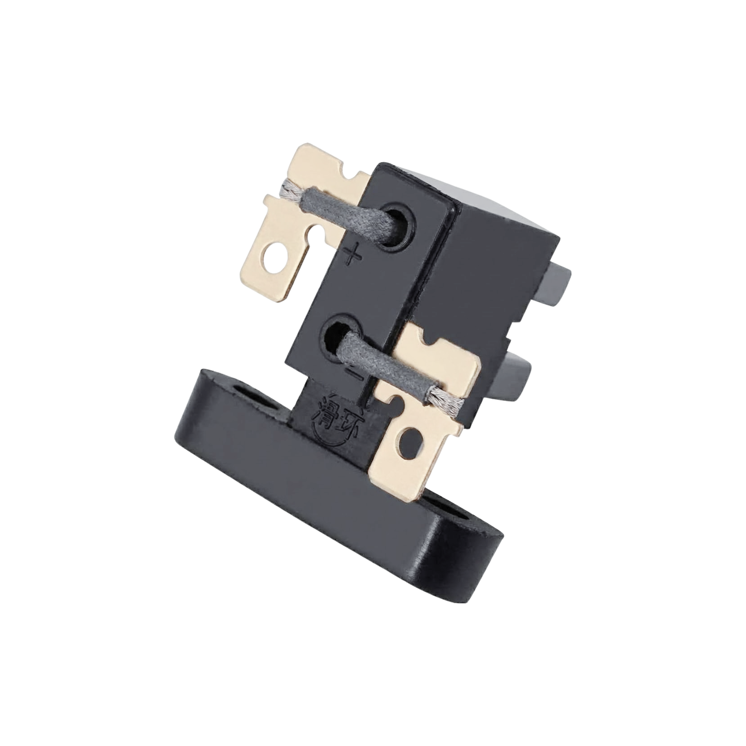 Die Baugruppe umfasst das isolierende Kunststoffgehäuse sowie zwei bereits montierte Kohlebürsten, die über flexible Kupferlitzen mit den Anschlusskontakten verbunden sind. Die Kontakte sind als flache Metallfahnen ausgeführt. Dank der Montagebohrungen an der Unterseite lässt sich der Halter präzise und fest im Gehäuse der Maschine verschrauben. Die Polarität ist direkt am Bauteil markiert, um Anschlussfehler zu vermeiden.