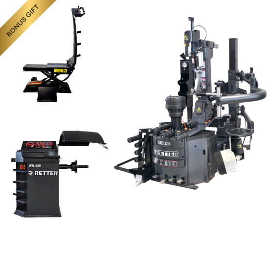 Mit diesem Set erhalten Sie die professionelle Reifenmontiermaschine RT-706F Pro, die Sie nach Wunsch mit einer passenden Reifenwuchtmaschine kombinieren können – und das zum attraktiven Setpreis. Als besonderes Bonusgeschenk erhalten Sie zusätzlich einen pneumatischen Radlifter (Radheber - RETTER LC-80) für die Wuchtmaschine, der Ihnen das Arbeiten noch komfortabler und effizienter macht.