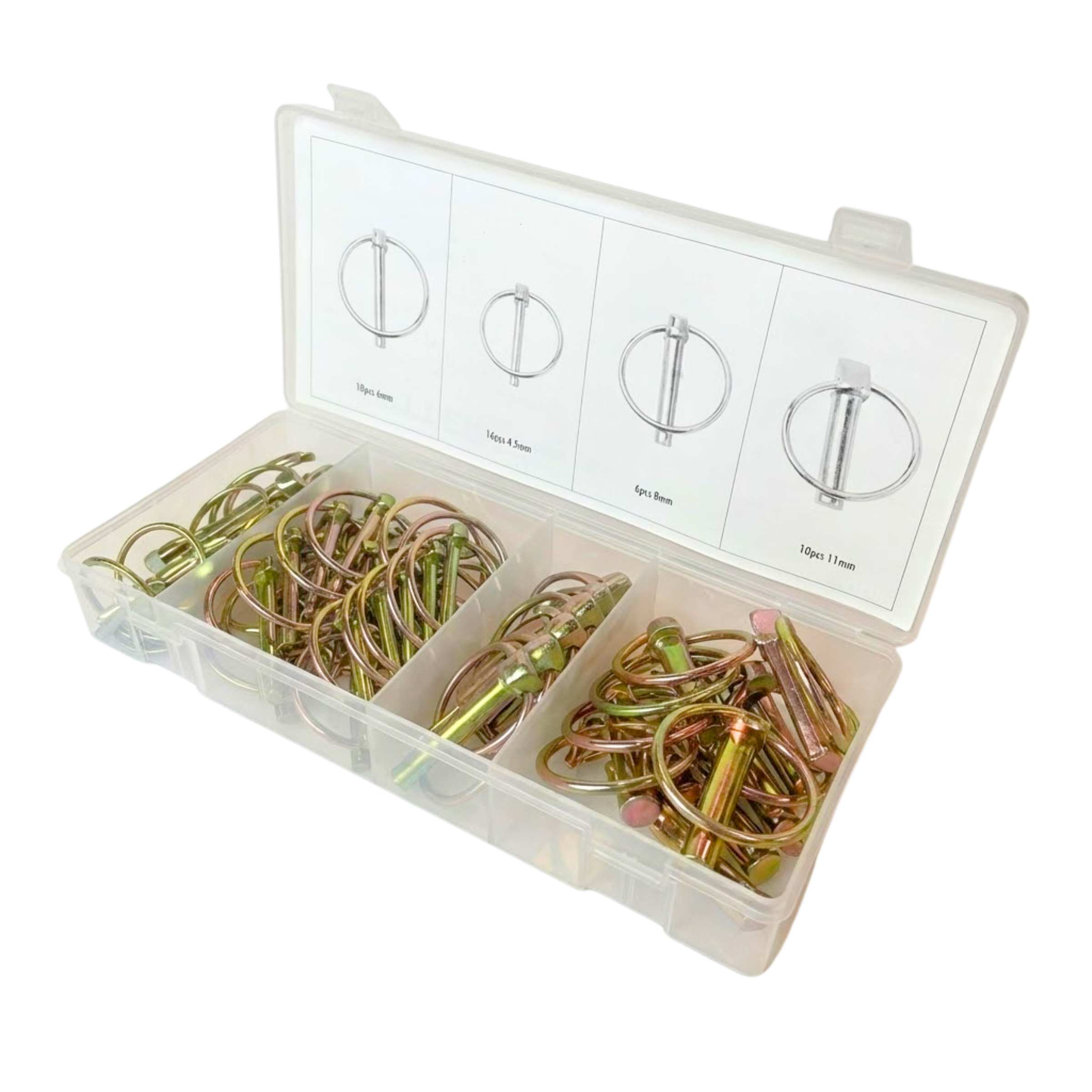 Das RETTER Splintbolzen-Sortiment 50-teilig|RTZ5244 enthält eine Auswahl an Federsteckbolzen in verschiedenen Größen. Diese Bolzen sind ideal, wenn Verbindungen schnell und sicher gelöst oder fixiert werden müssen – ob in Werkstatt, Landwirtschaft, Bau oder Freizeit.