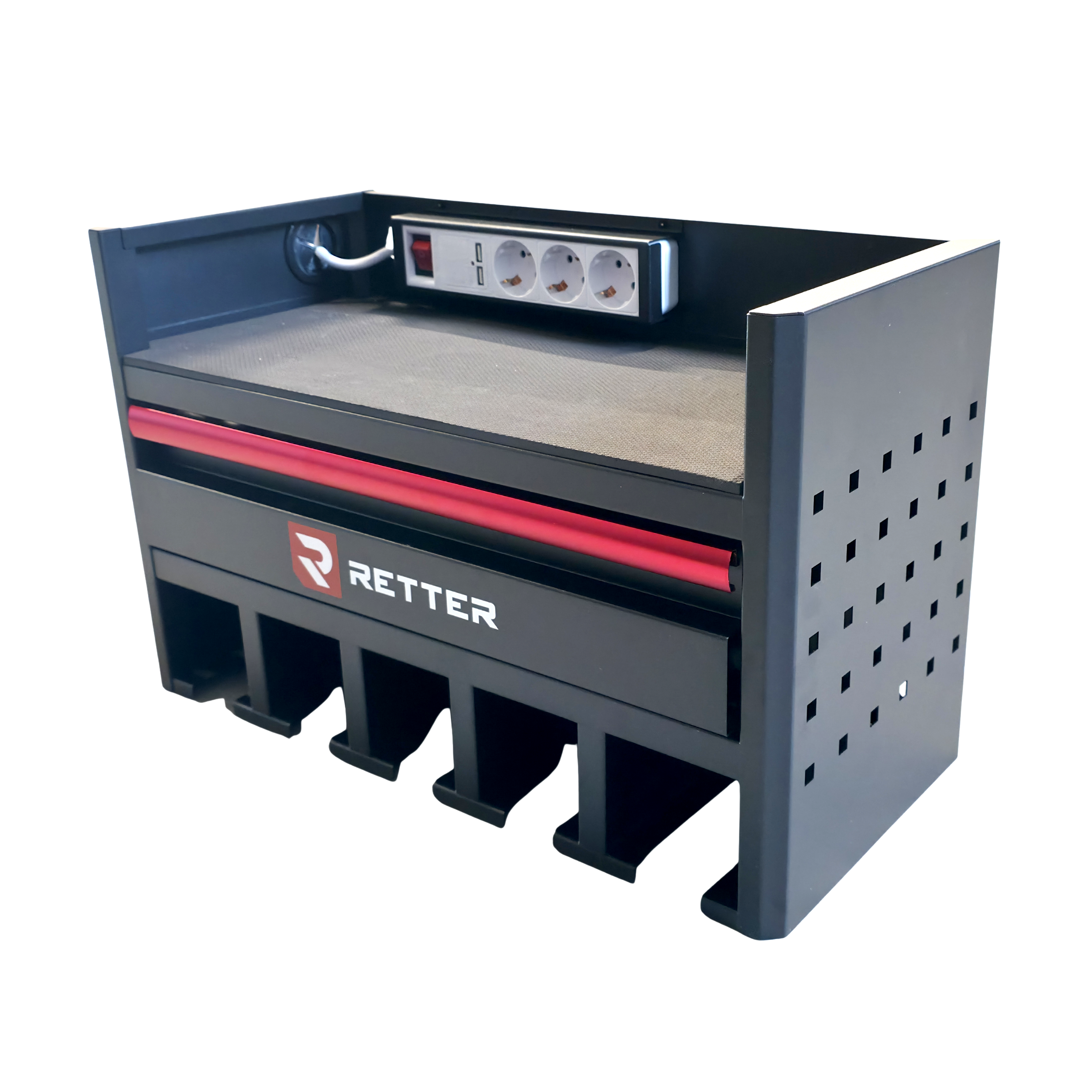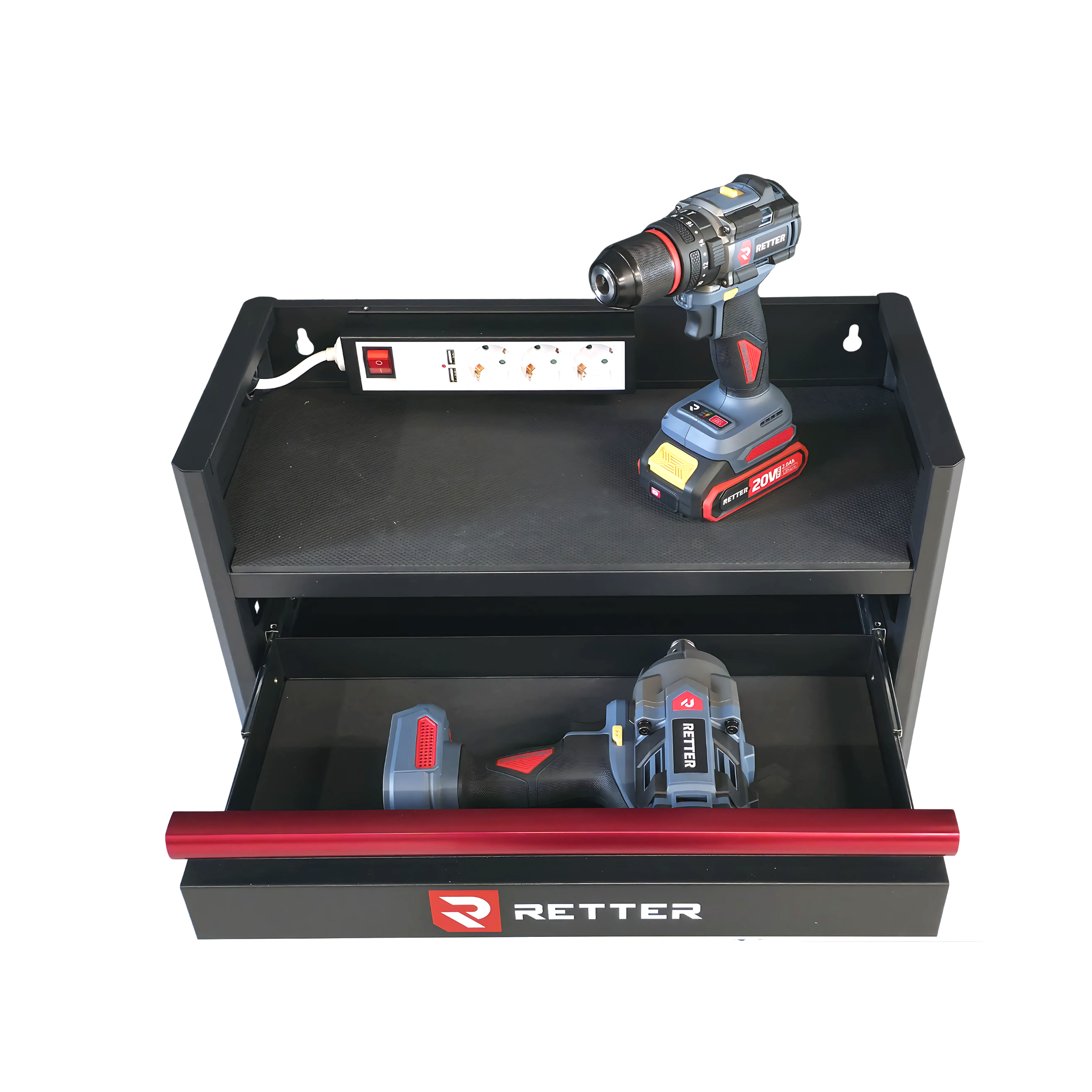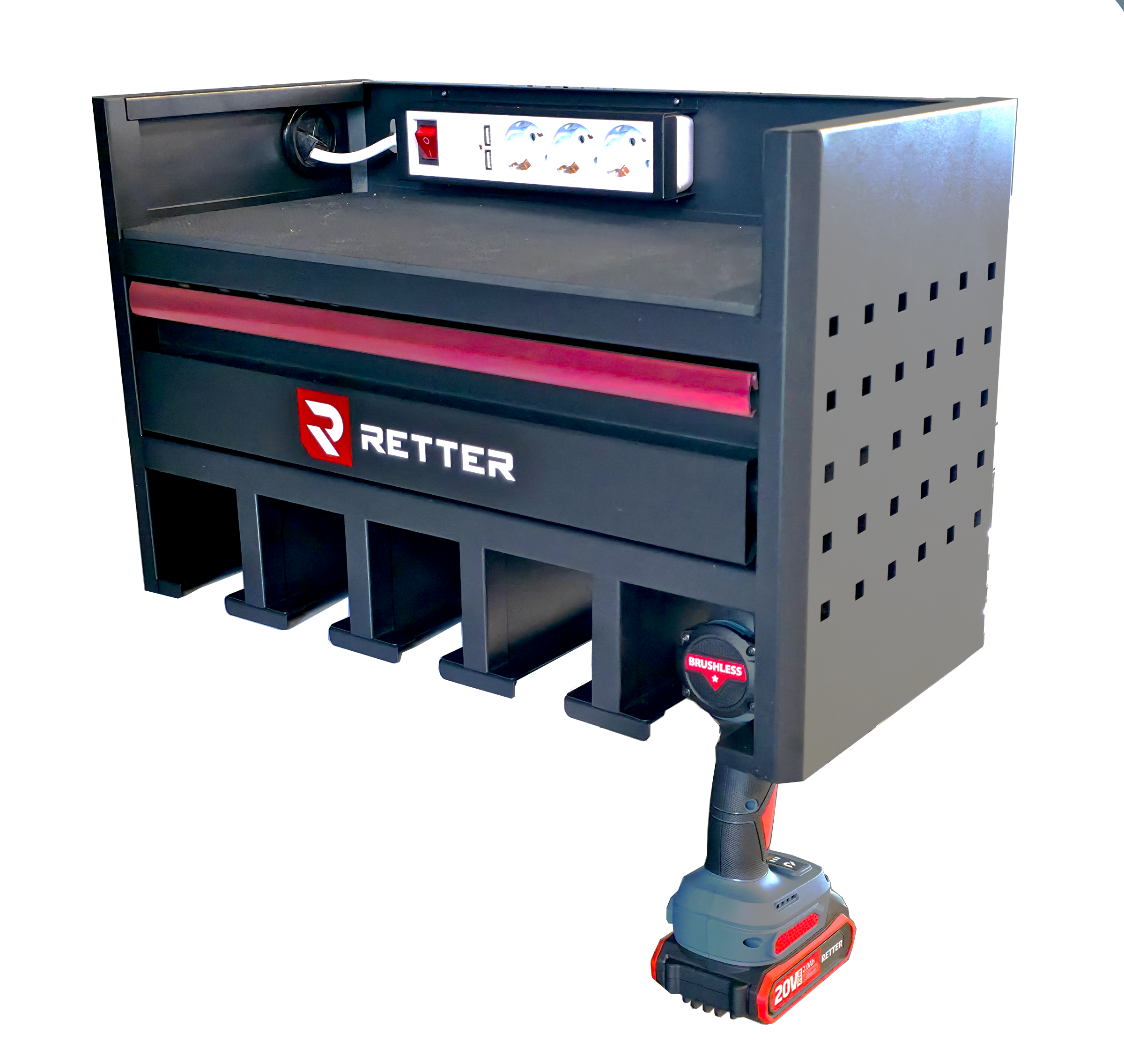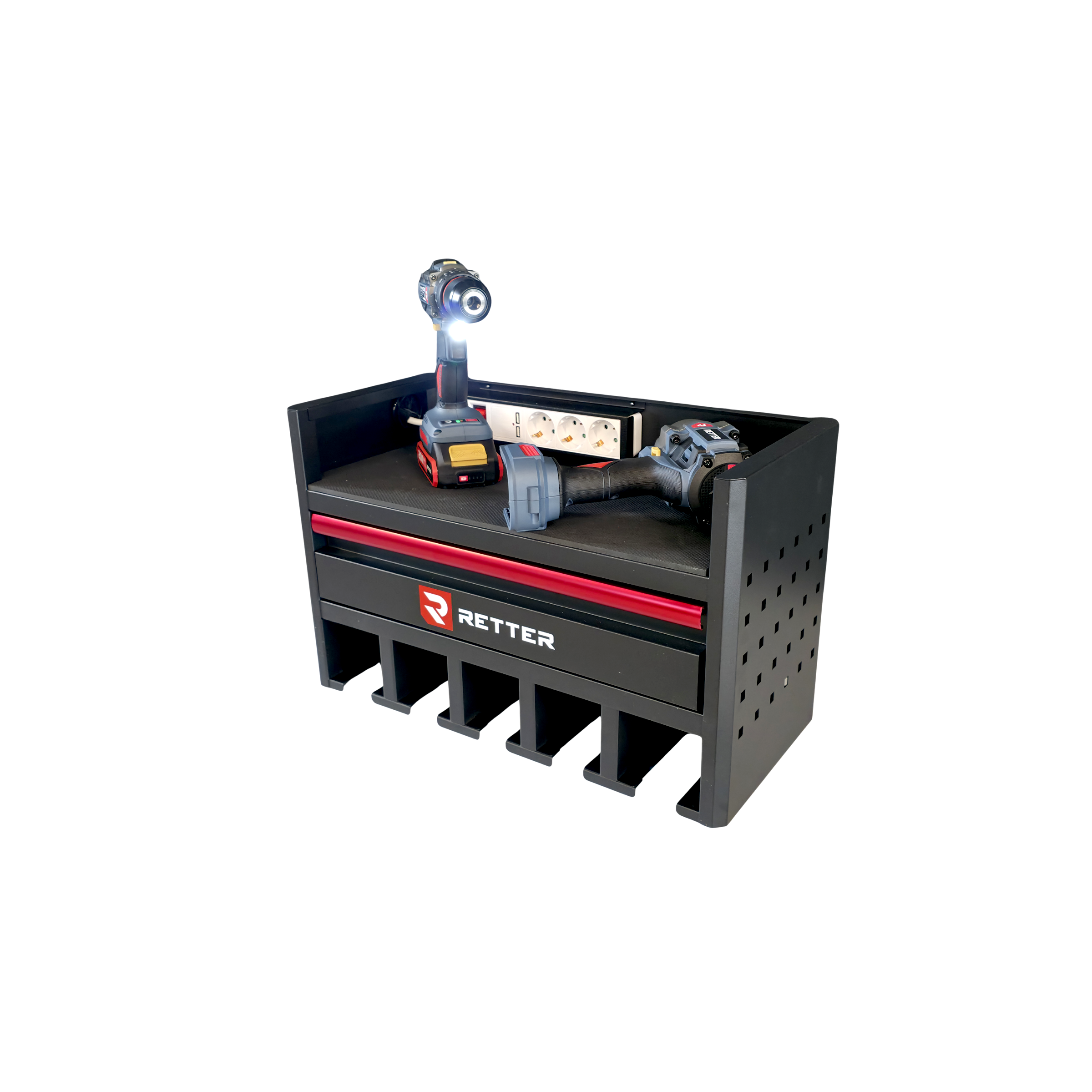 Der RETTER Akku-Werkzeug-Organizer mit Wandhalterung und Stromanschluss ist die ideale Lösung, um Ihre Werkstatt übersichtlich und funktional einzurichten. Dank der kompakten Maße von 54 x 25 x 34 cm bietet er ausreichend Platz für mehrere Akkuschrauber, Bohrmaschinen oder Bohrschrauber. Mit einer maximalen Belastbarkeit von 80 kg ist der Organizer äußerst stabil und zuverlässig.