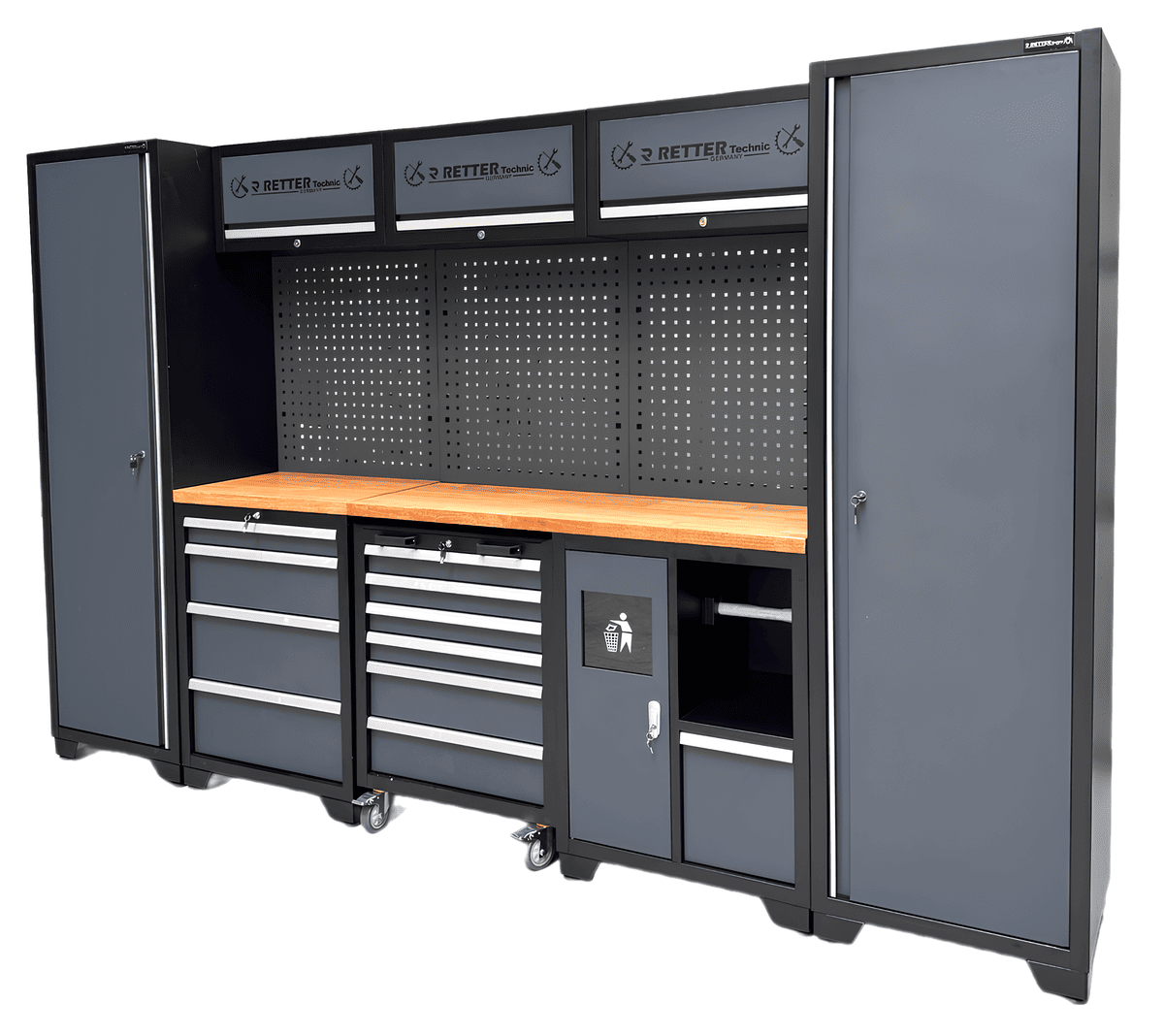 Zwei hohe Seitenschränke, integrierte Werkzeugschubladen, perforierte Rückwände zur Werkzeugaufhängung sowie eine robuste Massivholz-Arbeitsplatte machen dieses Set zu einer langlebigen und funktionalen Lösung für jede Werkstatt.